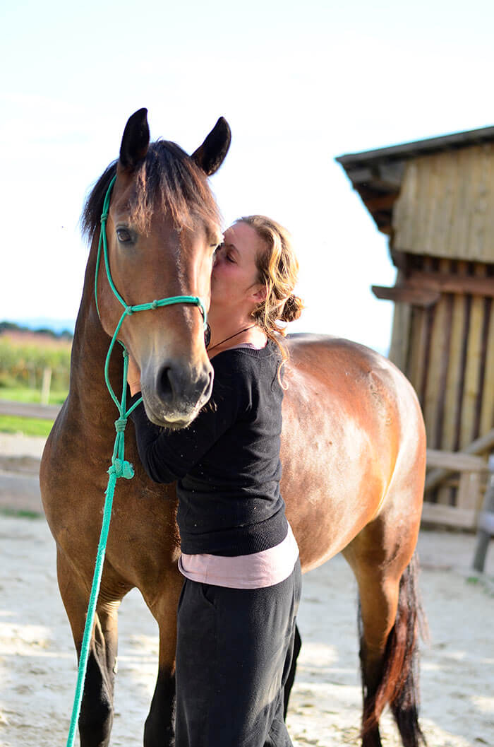 Nočem vas odvrniti od jahanja, želim si le, da se zavedate, kaj to pomeni. Našim konjem smo odvrgli vso opremo, ki povzroča bolečino, delajo po eno do dve uri na teden, pet mesecev med zimo imajo čisto pavzo od dela z ljudmi. Ne menjamo jih, ne prodajamo, so naša družina in bodo do svoje naravne smrti z nami. Živijo karseda naravno življenje v čredi, v prostem hlevu z velikim izpustom. Ne treniramo njih, da bi kot roboti ustrezali človeku, pač pa treniramo sebe, v senzitivnosti, prisotnosti, subtilnosti in široko odprtem srcu ter zavesti, da lahko delamo z njimi na način, ki jih je vreden in je obenem neverjetni doprinos našemu celostnem bitju.